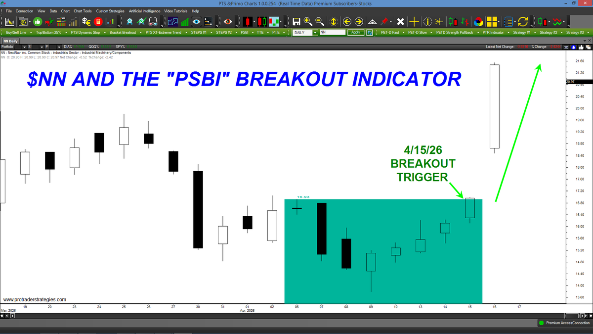 ANOTHER WINNING "PSBI" BREAKOUT TRIGGER, THIS TIME IN $NN! Our students around the world love this indicator because all one has to do is buy when price trades above the green displayed area. Only on the PTS Primo Charts at http://ProTraderStrategies.com (Signals for sudent education)