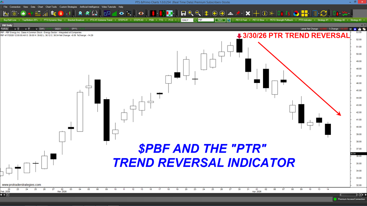 A TREND REVERSAL WAS SIGNALED IN $PBF LAST MONTH. This tool was designed to identify the bar where a trend reversal is most likely to take place. Apply to ANY market & time frame & available ONLY at http://ProTraderStrategies.com (All signals for student education only)