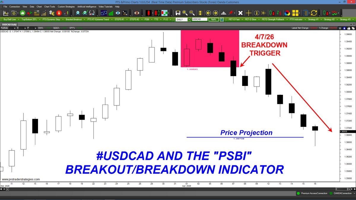 THE PRICE OF #USDCAD REACHED IT "PSBI" BREAKDOWN PRICE PROJECTION IN LESS THAN 2 WEEKS! A price projection is auto-displayed once price trades below the red breakdown area. ONLY on the PTS Primo Charting Platform at http://ProTraderStrategies.com (All signals for student education only)