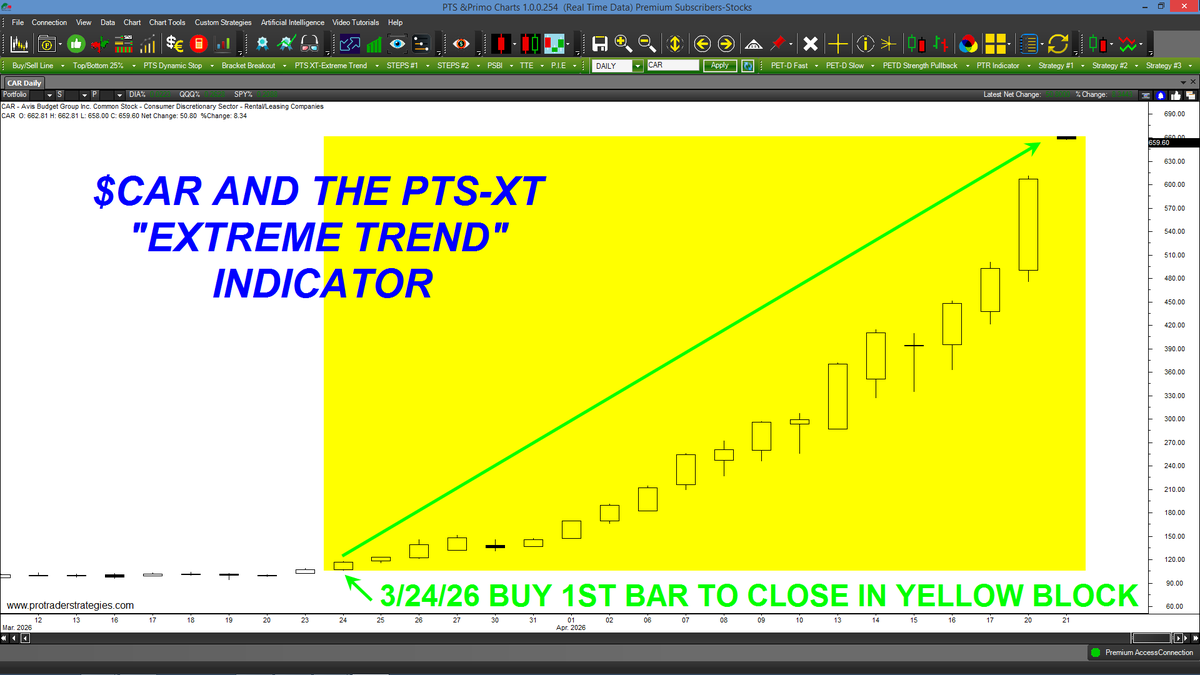 STUDENTS WHO TRADE WITH THE "PTS-XT" DIDN'T MISS THE +550 PT UP-MOVE IN $CAR! Still struggling with your trading? What are you waiting for? Contact http://ProTraderStrategies.com & get the powerful PTS-XT "Extreme Trend" Indicator today (All signals for student education only)