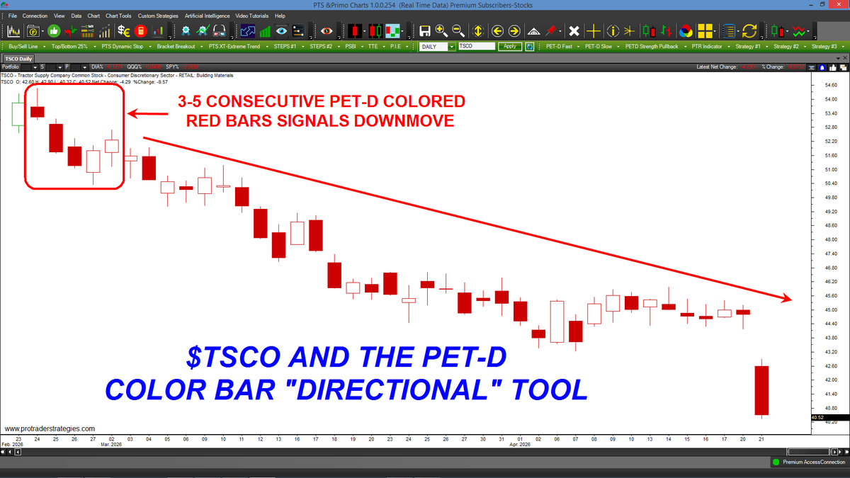 OUR PET-D COLOR BAR TOOL SIGNALED A DOWN-MOVE IN $TSCO OVER 2 MONTHS AGO. 3-5 consecutive PET-D colored red bars signals a down-move in ANY market or time frame. The ORIGINAL PET-D can only be found at http://ProTraderStrategies.com (All signals for student education only)