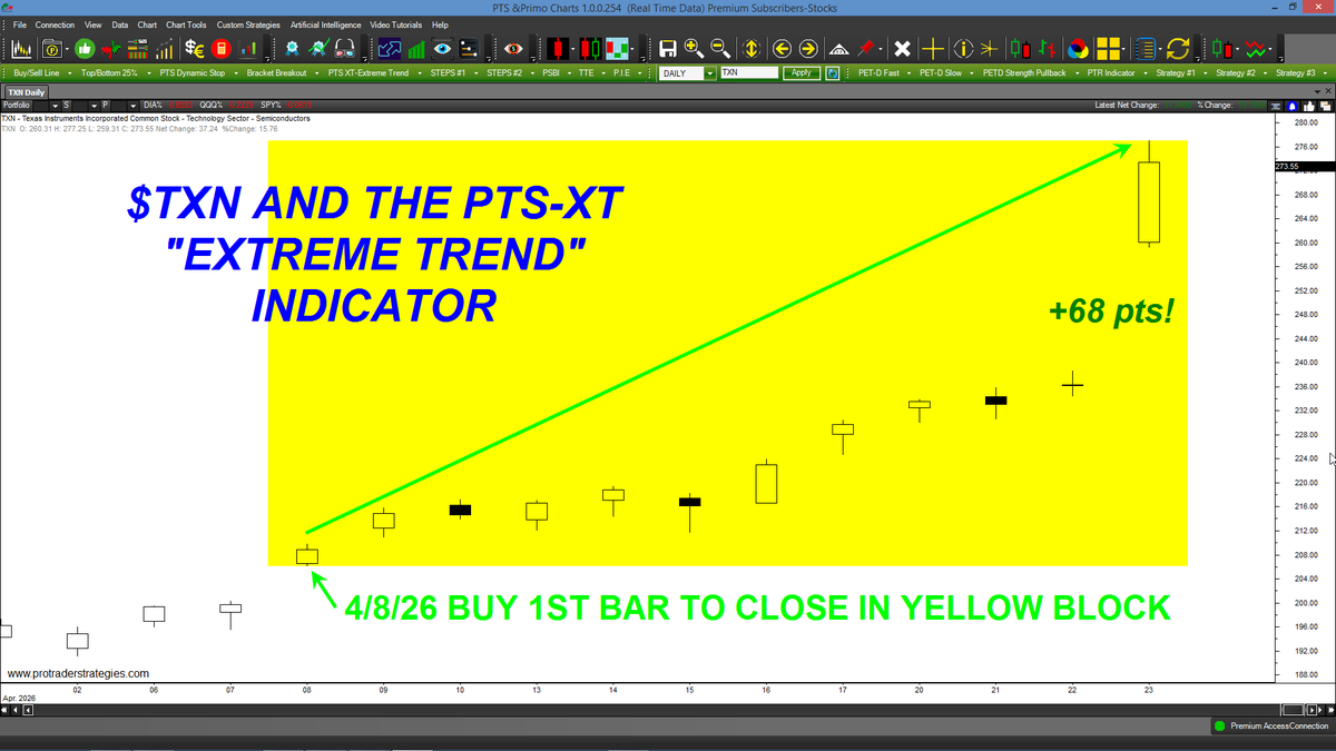 THE PRICE OF $TXN HAS SOARED +68 PTS WHILE IN THE PTS-XT YELLOW BLOCK! The "PTS-XT" tool identifies extreme trends in ANY market or time frame in advance & can ONLY be found at http://ProTraderStrategies.com (All signals for student education only)