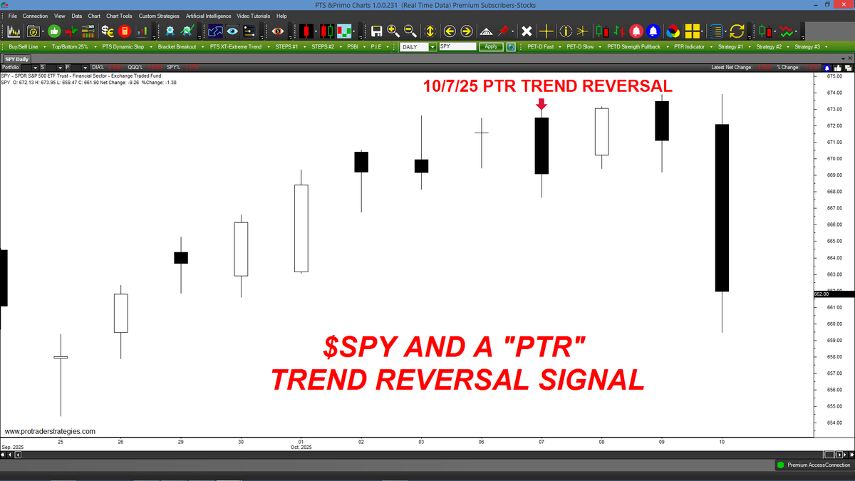 THE "PTR" GENERATED A TREND REVERSAL SIGNAL IN $SPY, THE ETF THAT MIRRORS THE S&P 500, FOUR DAYS AGO! The "PTR" was designed to identify bars where a trend reversal is most likely to take place. Apply to ANY market & only at http://ProTraderStrategies.com (Signals for education only)