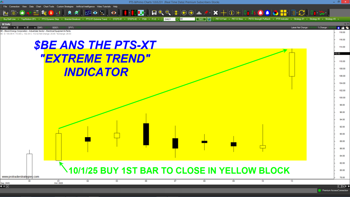$BE SOARED TODAY IN THE PTS-XT YELLOW BLOCK! As long as price remains in the yellow block, an extreme PTS-XT up-move is likely to take place. The original PTS-XT Indicator is only found on the PTS Primo Charts at http://ProTraderStrategies.com (All signals for student education only)