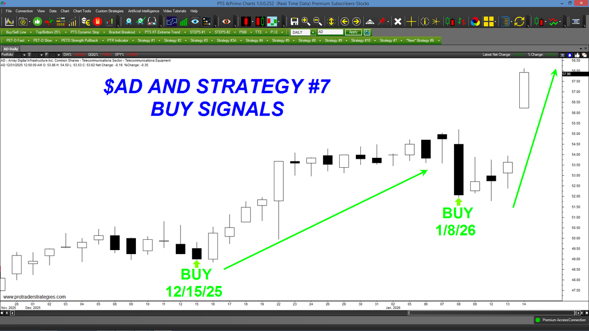 "PULLBACK" STRATEGY #7 CAUGHT THE MOST RECENT LOWS IN $AD. Strategy #7 is one of our premier "Pullback" methods, and is designed to buy near the lows of a up-trending market. Available ONLY at http://ProTraderStartegies.com (All signals for student education only)